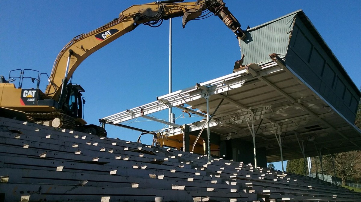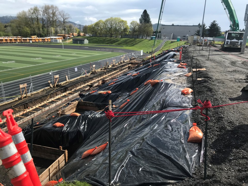 In Spring of 2018 our Konell crew led by foremen Greg McIntosh, Dewey Clarke and demolition lead Josh Konell began the demolition and excavation of the 60 year old stadium at Alder Creek Middle School to clear the way for P&C Construction to build a new stadium using the same footprint in time for the Fall 2018 Football season for use by Milwaukie High School. Konell crews worked to excavate the footings, fire lane, ADA ramps and North Parking lot improvements. At the same time our crews performed the underground and prep work for the North parking lot as well as the visitor’s bleachers. All underground utilities, including Sanitary Sewer, Storm Sewer and Domestic Water were replaced for the new Grandstands.