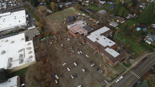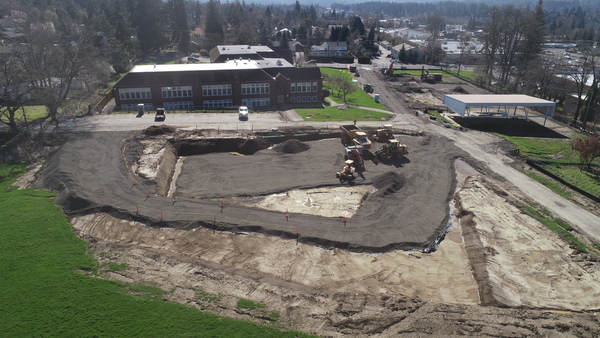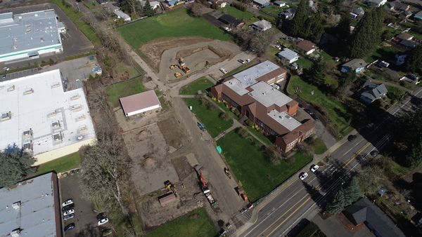 Working with P&C Construction, Konell completed demolition, mass excavation, and full site prep for the new library building, including storm, sewer, and water utilities, along with restoration of the existing building and installation of an extensive underground detention system made of modular plastic storage units.